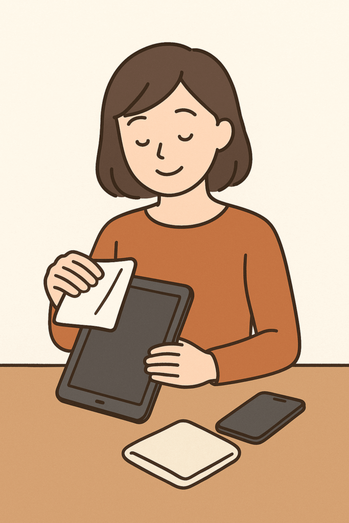 タブレットやスマホの画面には、指紋や汚れがびっしり付いています。毎朝と毎晩、それらを拭き取ってあげましょう。特別な道具は必要ありません。日頃テーブルを拭くような、少し湿らせた布巾と、最後に拭き上げるための清潔な乾いたタオルだけで十分です。