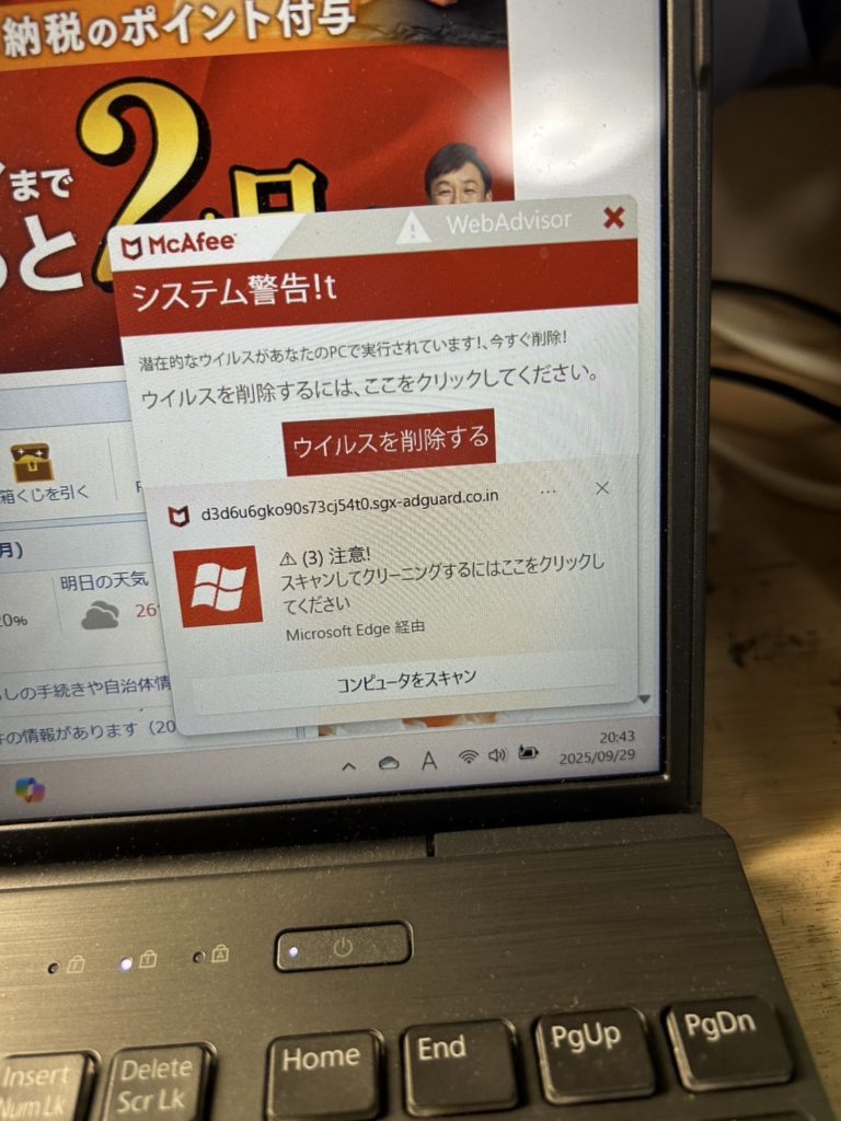 McAfee本体をWindows11の「設定」「アプリ」から削除したはずのパソコンで、McAfeeのアラートが表示されたという連絡をいただき、お客様のもとへ伺いました。