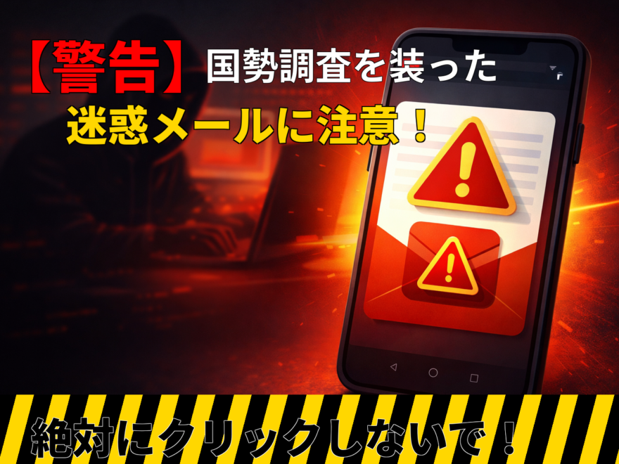 このメールは国勢調査を偽装しており、下記のような「脅し」が含まれ、たいへん悪質なものです。実際の国勢調査は調査員により配布された書類または、書類に記載された二次元コードにより行われるため、メールでの依頼はありません。リンク先は偽装されたページが開きます。このようなメールが届いても、絶対にクリックしてはいけません。
