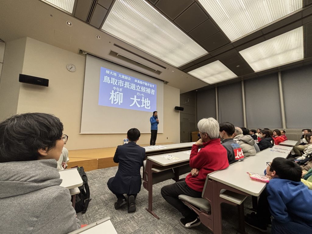 さて、ここまで説明したところで、今日私は鳥取市長選挙に立候補した柳大地さんという若い新人候補の方の決起集会に行ってきたということを表明しておきます。柳さんとは、以前から多少なりとも面識があって、応援していました。とはいえ、私は選挙区の住民ではありませんので、投票権はありません。ただ、鳥取市を拠点に働いている立場としては、本気で活動している方にがんばってもらいたいという思いからこの記事を書いています。